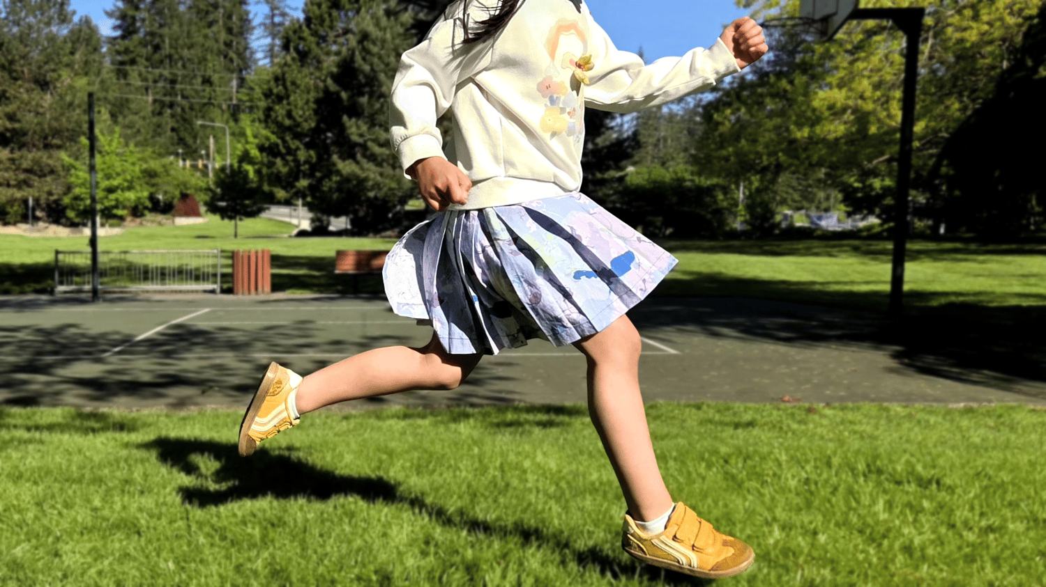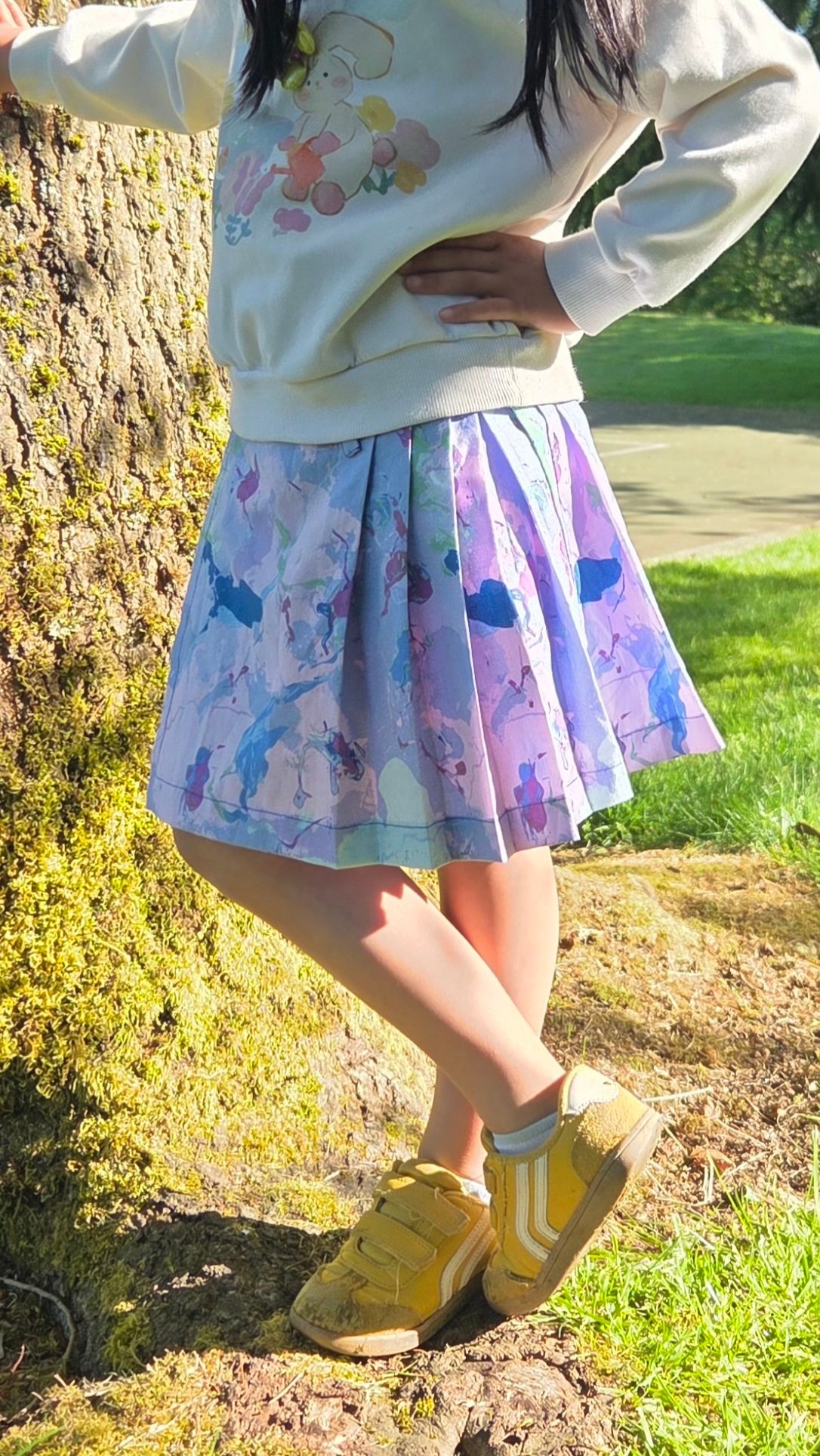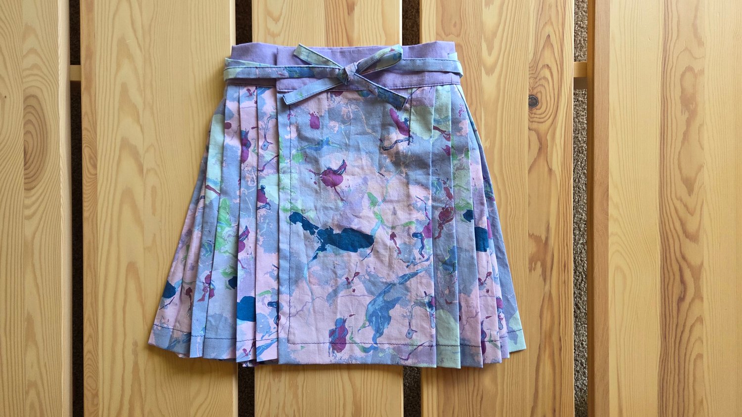 The youth skirt ("like a science experiment!") is made from quilting cotton. It's made for a 22½"(57cm) waist, 26"(66cm) hip, and 14"(36cm) waist-to-hem.
