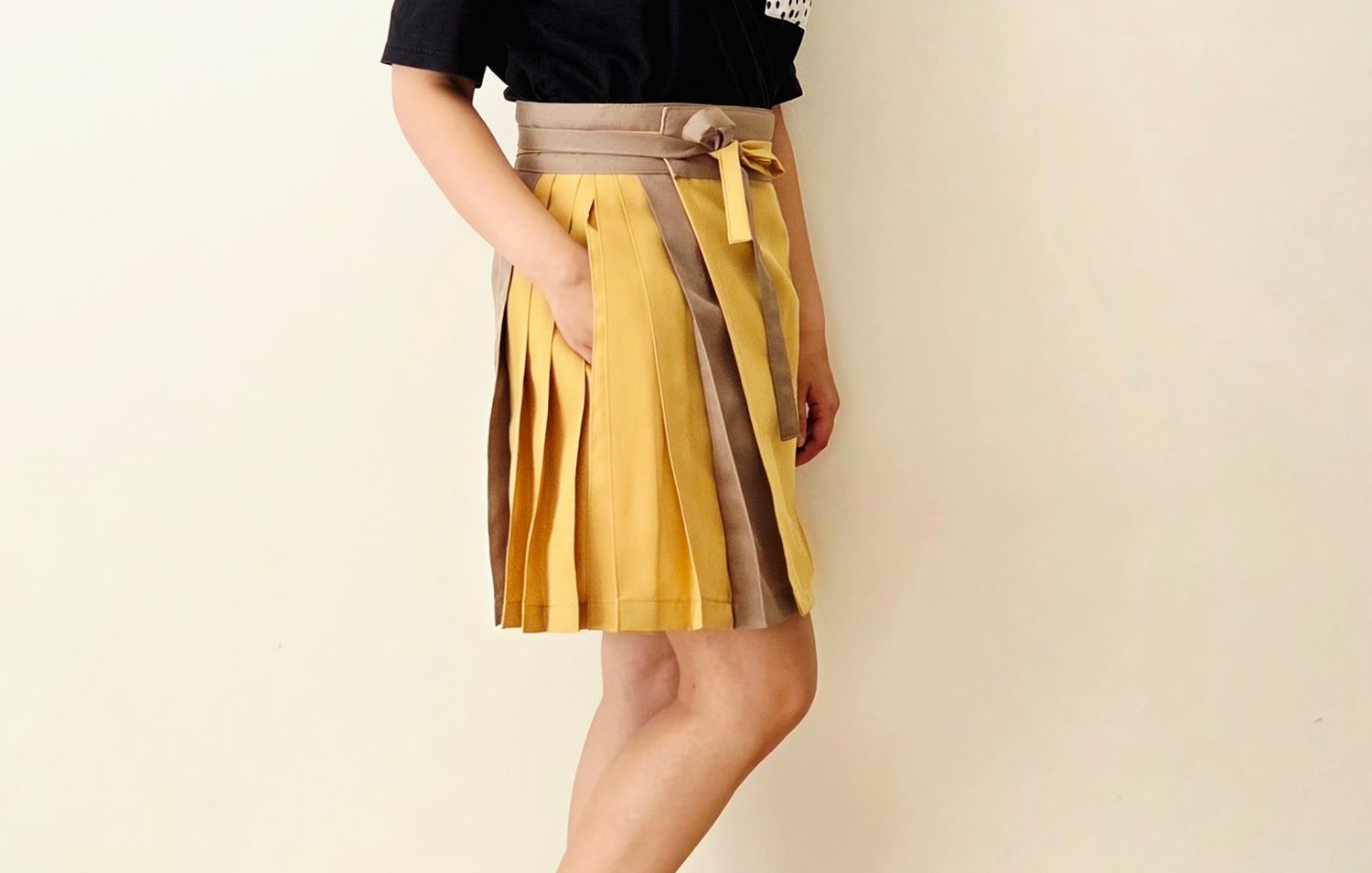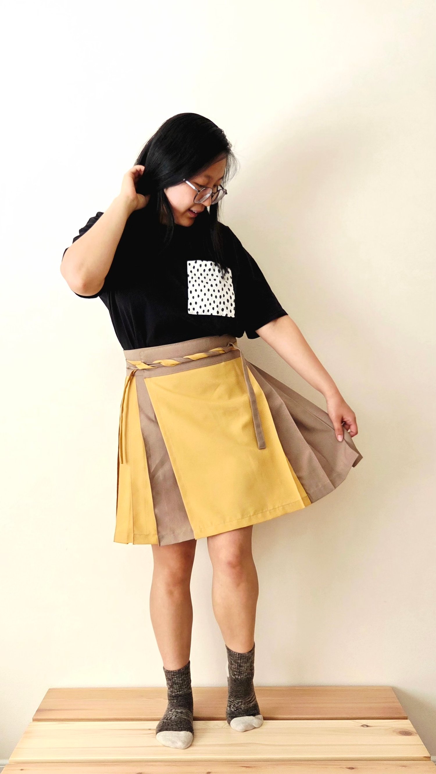 The color-blocked skirt (mustard/taupe) is made from a medium-weight polyester poplin with no modifications. The model is 5"3' (160cm), with a 31½"(80cm) waist and a 39⅜"(100cm) hip.