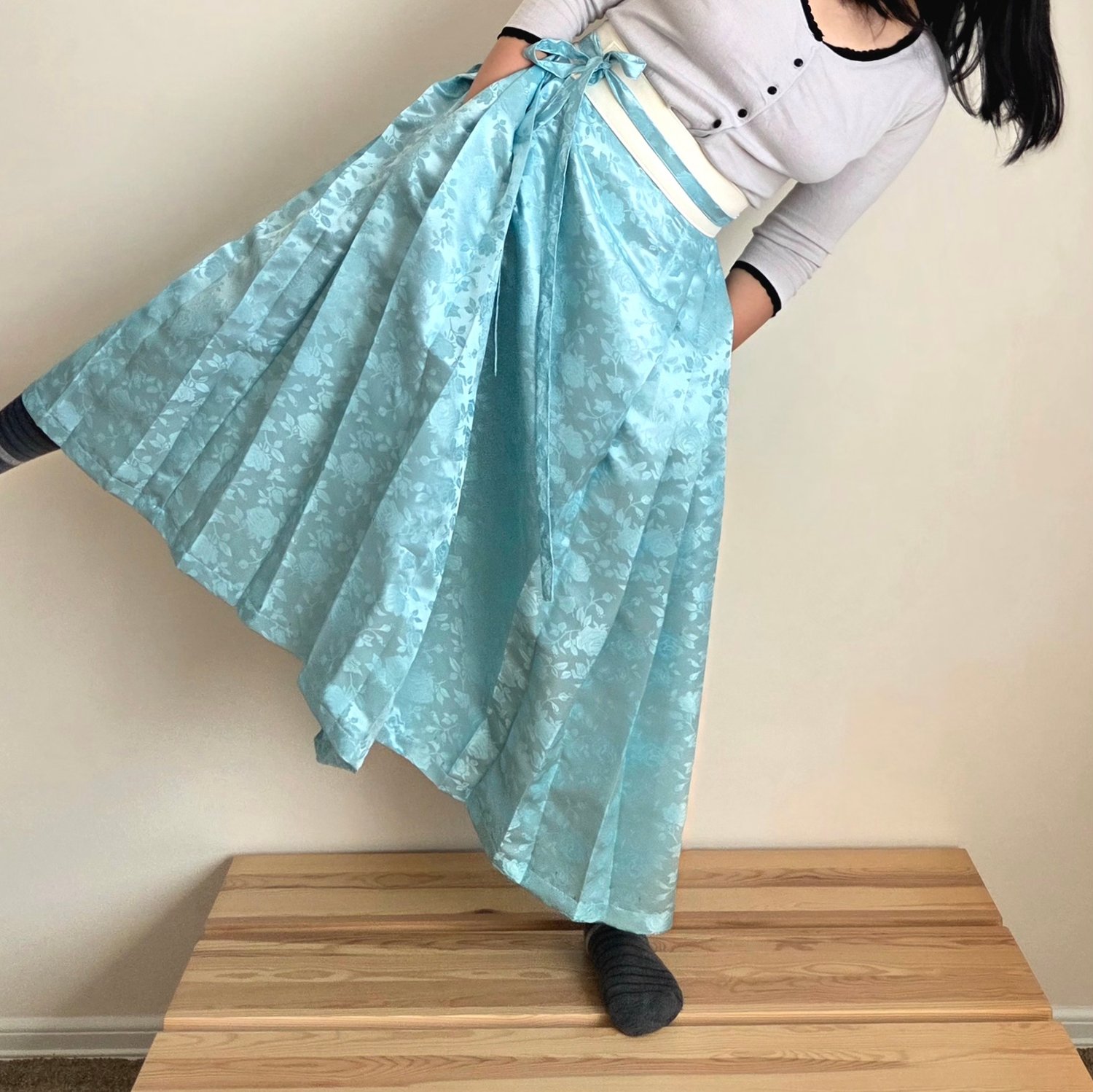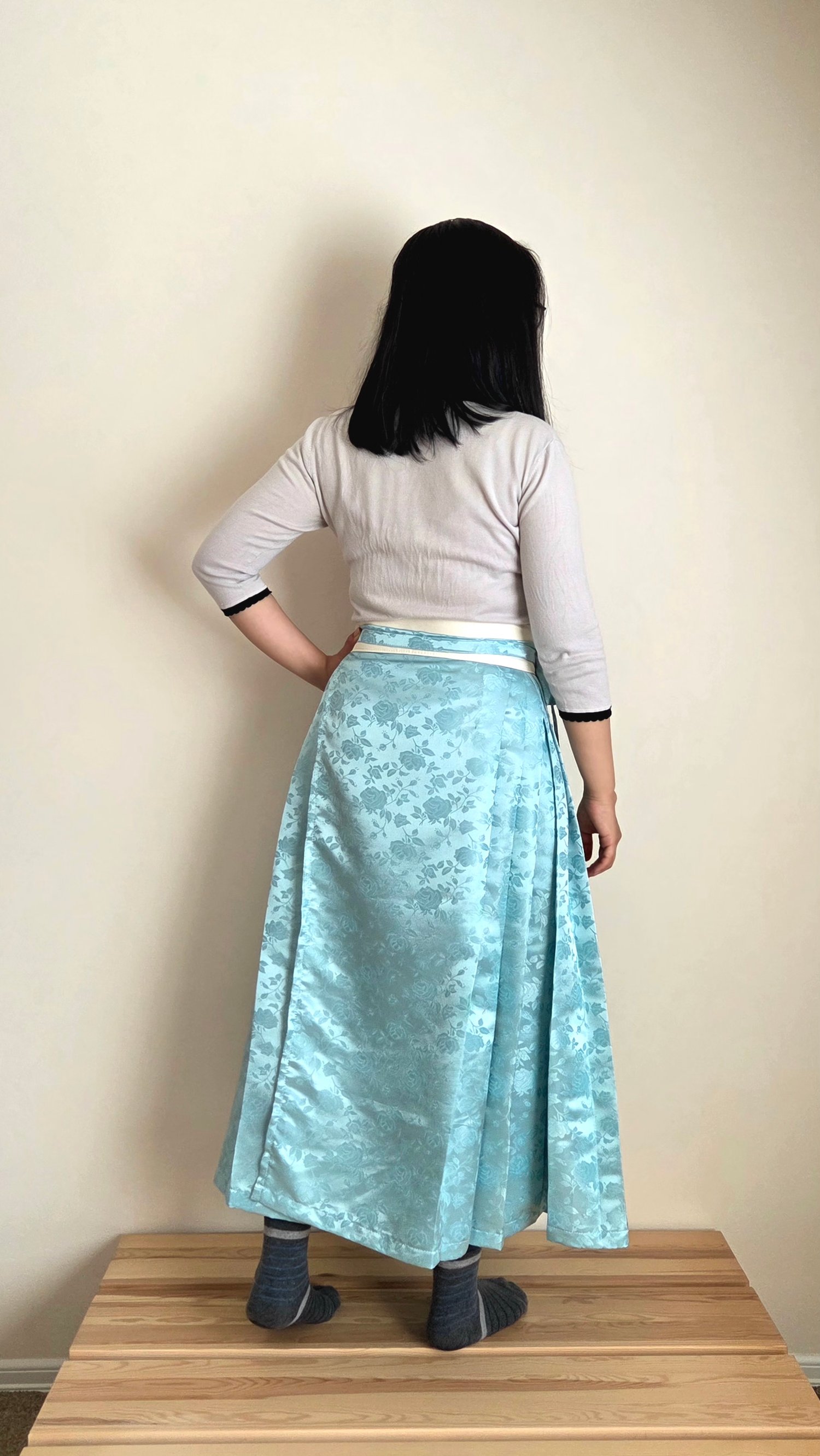 The mint skirt is made from a mid-weight polyester jacquard with a cotton waistband. It has a 33½"(85cm) waist-to-hem, and ties are lengthened by 5"(12cm). Same model as above.