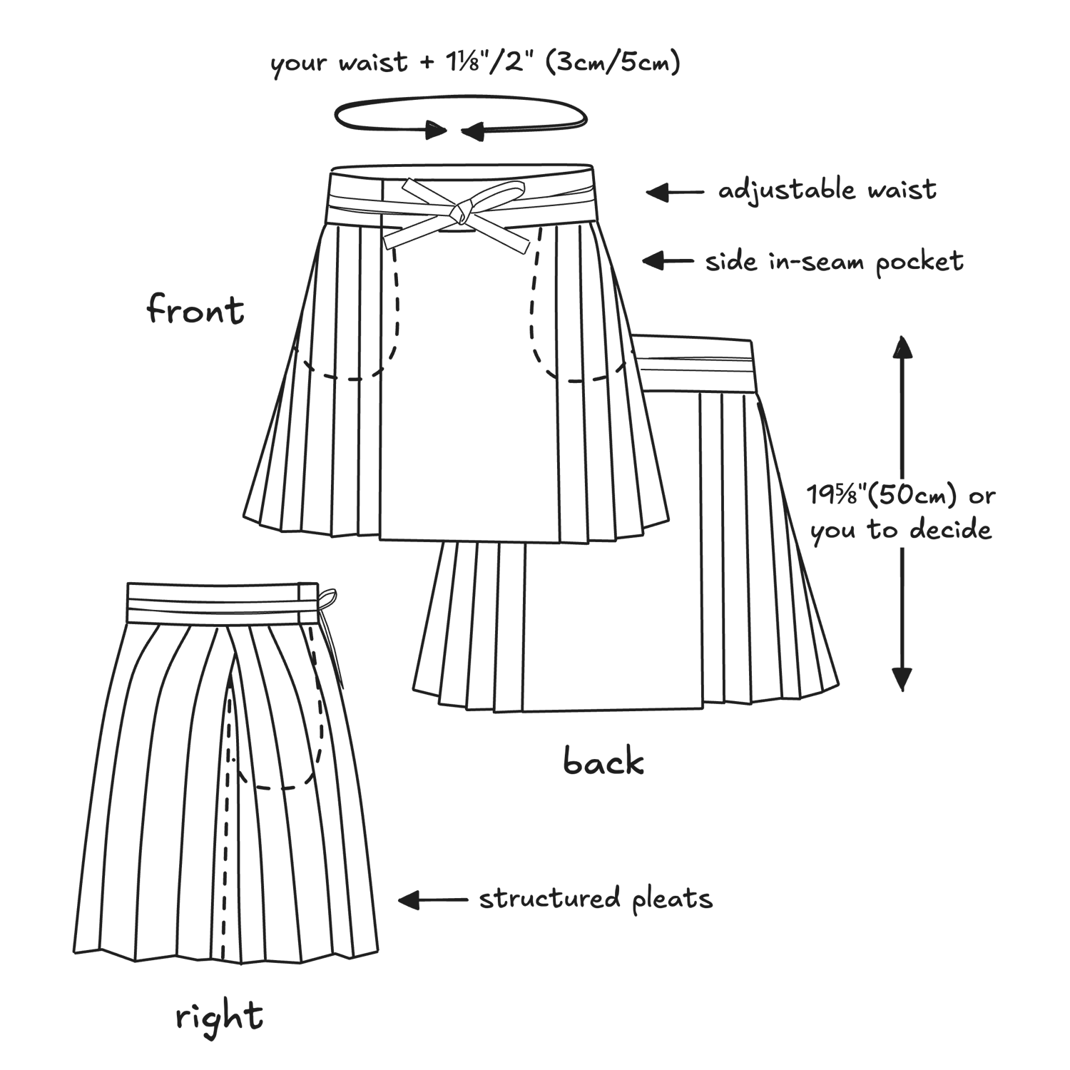 - Waist ease: 2" (5cm) for a larger waist, or 1⅛" (3cm) otherwise
